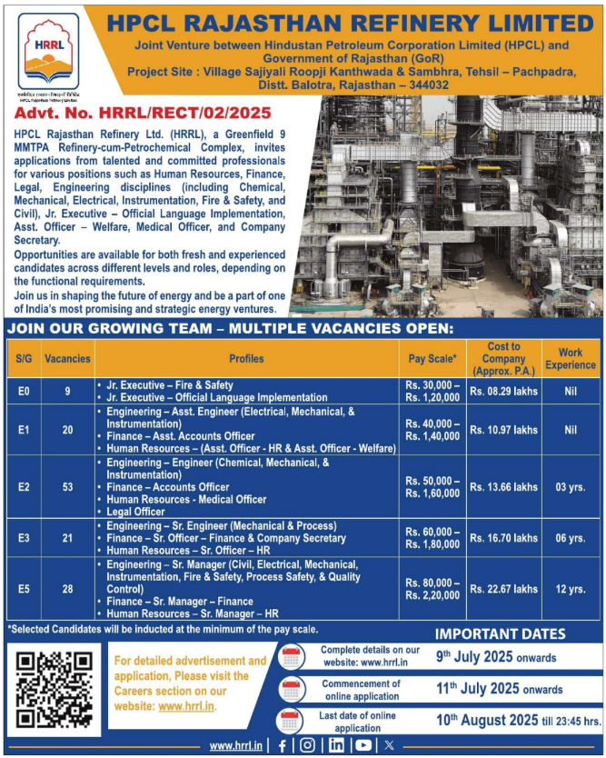 HPCL Rajasthan Refinery Ltd (HRRL) is recruiting for 131 vacancies for various professional roles. The available posts include Engineer, Officer, Manager, and Executive in different departments. These are regular positions located at the project site in Balotra, Rajasthan. The official advertisement was released on 09/07/2025. Interested candidates from India can apply online from 11/07/2025 to 10/08/2025 on the official website www.hrrl.in.