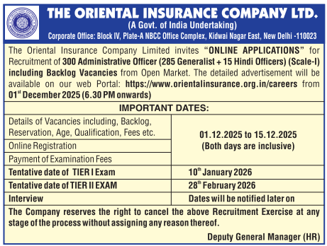 The Oriental Insurance Company Limited is hiring new employees. They want to recruit for the post of Administrative Officer (Scale-I). There are total 300 vacancies for this job recruitment. The short notice was released on 25/11/2025. This job is located in India. You can apply for this job from 01/12/2025 to 15/12/2025. Anyone from India can apply for this job if they are eligible.